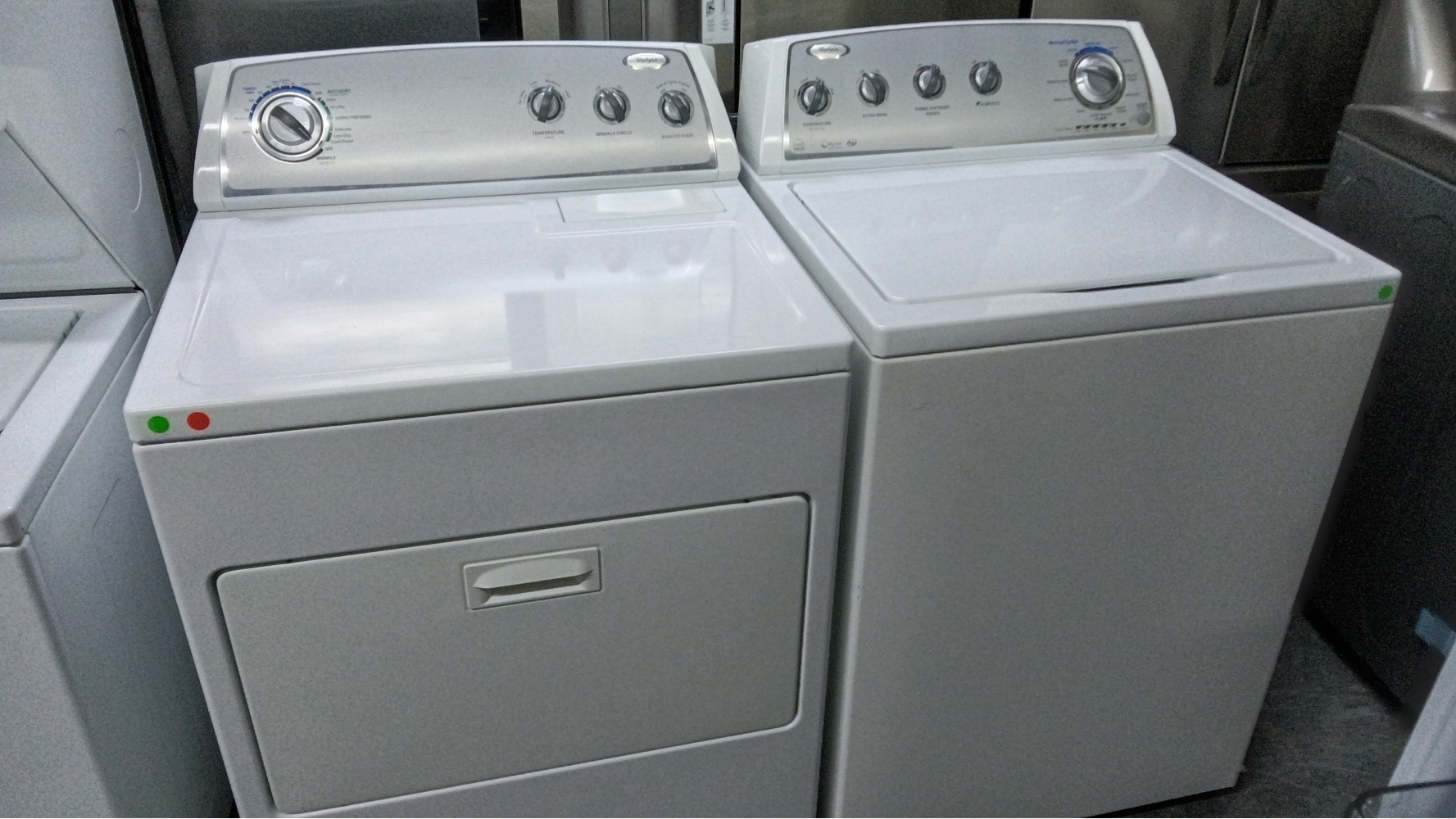 pre-owned whirlpool 3.6 cu. ft. high-efficiency top-load washer & electric 220v dryer (white)