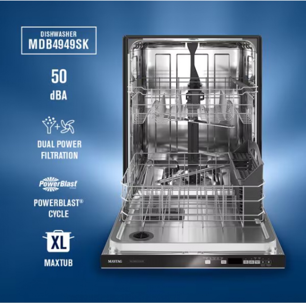new-maytag 24” front control dishwasher with dual power filtration and powerblast cycle - 50 dba (fingerprint resistant stainless steel)