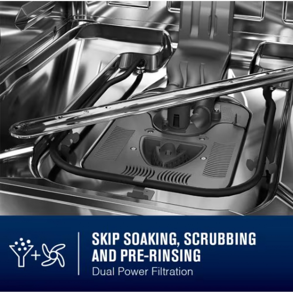 - skip soaking, scrubbing and pre-rinsing with dual power filtration: skip soaking, scrubbing and pre-rinsing with maytag engineering that puts an end to pre-work. industry-exclusive dual power filtration combines 100% microfiltration and a 4-blade stainless steel chopper to filter out then dispose of any food in its path.