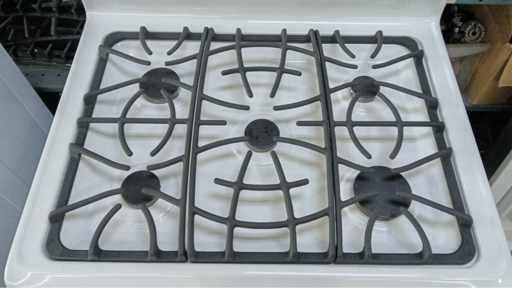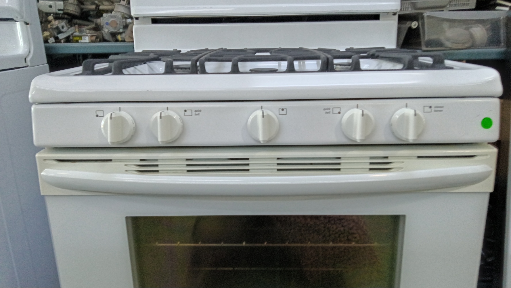 pre-owned frigidaire gallery series 30 inch freestanding gas range with 5 sealed burners, 5.0 cu. ft. quick bake convection oven, self-clean, temperature probe and storage drawer (white)
