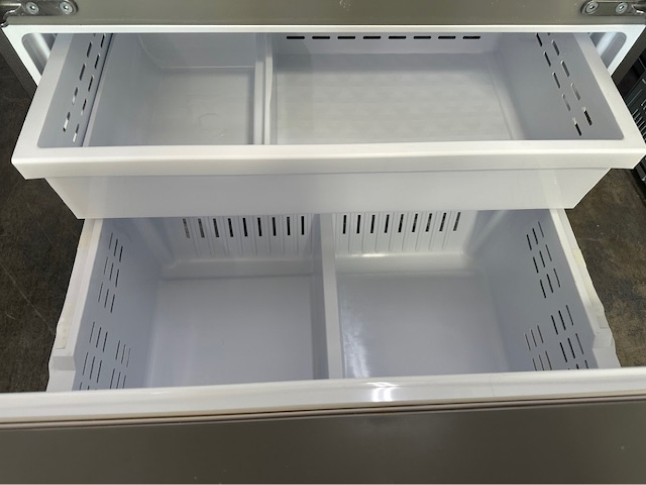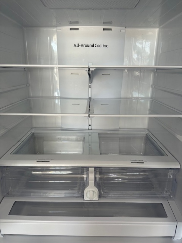 pre-owned samsung 36 inch smart 3-door french door refrigerator with 32 cu. ft. total capacity (fingerprint resistant stainless steel)